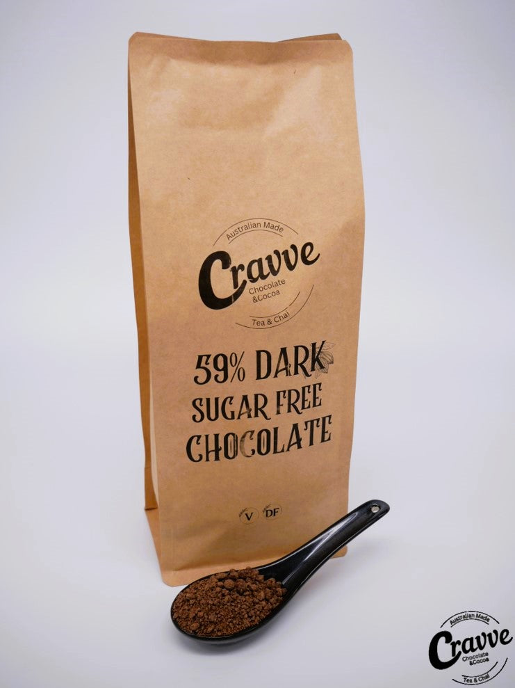 Delicious 59% dark chocolate blended with natural birch xylitol and conched over 2 days on traditional granite stone - kibbled and ready for deliciously real chocolate beverages.
